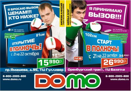 Сеть бытовой техники и электроники Domo в октябре открыла сразу два магазина в Казани. В ночь с 21 на 22 октября начал работать супермаркет ритейлера на ул. Ямашева, а также после реконцепции открылся гипермаркет на Оренбургском тракте. Рекламная кампания, приуроченная к запуску двух объектов, получила название «состязание за звание лучшего» и прошла под девизом «Этой ночью цены будут бороться за покупателя!».