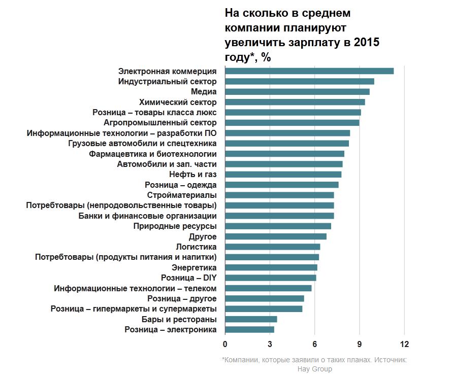 Поднимать сотрудникам зарплаты в 2015 году планируют 75% работодателей, показал опрос, охвативший 412 работающих в России компаний из 18 секторов экономики (проводился в январе). Наибольшее повышение планируют компании электронной коммерции (на 11,3%), в индустриальном секторе (на 10%), медиаотрасли (9,7%), химпроме (на 9,4%), розничной торговле товарами класса люкс (9,1%). "Например, ретейл-люкс не чувствует проблем", – отмечает руководитель отдела исследований Hay Group Ирина Чернозубова. По ее словам, ничего необычного в этом нет – рост примерно такой же, как в предыдущий кризис. Но планы компаний в последние годы оказывались, как правило, завышенными, оговаривается она. В международных компаниях из индустрии фармацевтики индексация действительно составит 8–10%, но в целом средние ожидания немного преувеличены, считает партнер хедхантинговой компании "Агентство Контакт" Юлия Забазарных. По ее словам, в России повышать зарплаты будут, вероятно, лишь "крупные прогосударственные организации". "Большинство компаний, за исключением крупнейших корпораций, не имеют на это финансовых ресурсов", – говорит она. По итогам 2014 финансового года бонусы выплатили 84% компаний, почти в 80% случаев выплаты производились в рамках принятой ранее политики, показал опрос. Многие компании, вероятно, еще не приняли "генеральный план действий" на случай кризиса, самые существенные изменения могут быть еще впереди, предполагает Чернозубова.