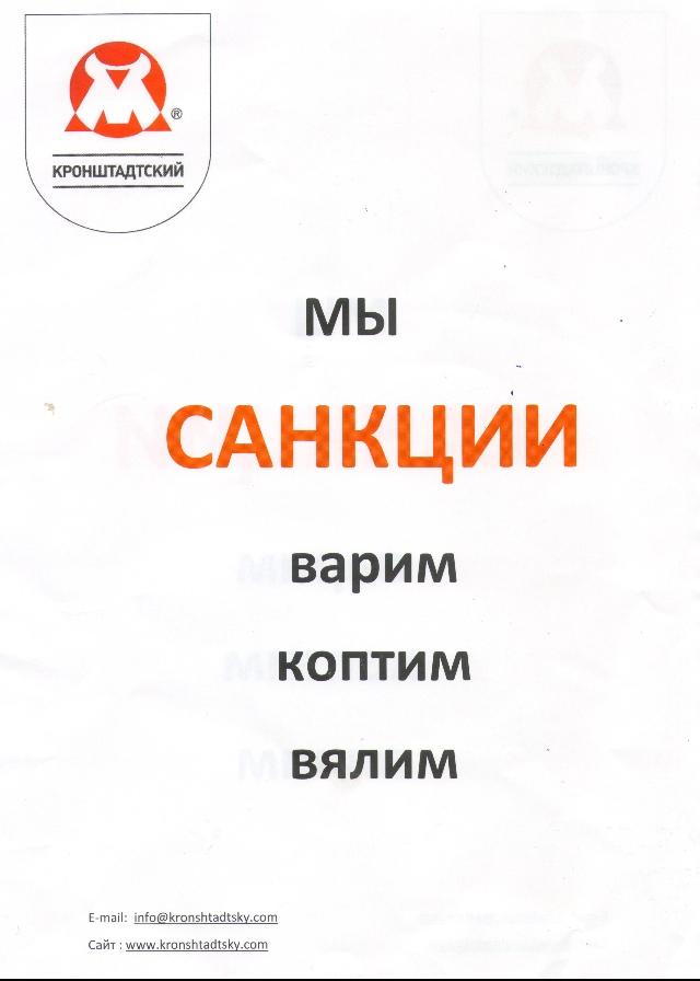 Еще одна компания, решившая обернуть тему санкций на пользу маркетингу, — Кронштадтский мясоперерабатывающий завод. Своим слоганом, который красовался на упаковке товара, печатной продукции и фирменных пакетах, производитель выбрал "Мы САНКЦИИ варим, коптим, вялим".