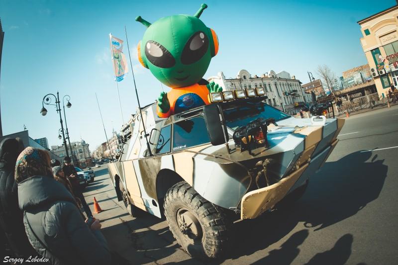 В День защитника Отечества сеть магазинов компьютерной техники DNS провела несколько мероприятий на главной площади Владивостока. По билету, который вручался ранее при покупке, можно было прокатиться на бронированной разведывательно-дозорной машине. А еще пострелять в тире из страйкбольного оружия — полной копии настоящего боевого, состоящего на вооружении Российской армии, и получить памятный подарок — магнит. На тематической площадке рядом с тиром можно было подержать в руках легендарное оружие времен Великой Отечественной войны — винтовку Мосина, пистолет-пулемет Шпагина и пистолет-пулемет Судаева. И сфотографироваться с танком МС-1 и БТР-40.