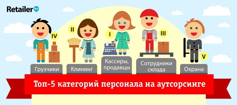 Средняя доля HR-аутсорсинга в торговых сетях составляет 15−20%. Максимальная планка может достигать 50%. 16% респондентов используют сторонний мерчендайзинг. Чаще всего персонал на аутсорсинге привлекают для работы в больших форматах — гипермаркетах и супермаркетах.
