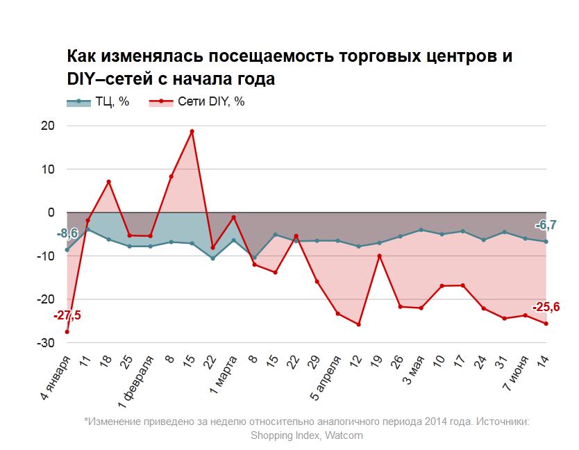 Мария Евневич, член совета директоров петербургской компании "Максидом" (пятое место в рейтинге DIY-сетей России 2013 года "INFOLine-Аналитики"), также подтвердила начало снижения трафика с апреля 2015 года. Так, в июне по сравнению с аналогичным периодом прошлого года падение потока покупателей в магазинах Санкт-Петербурга составило около 8%, выручка просела на 5%, отмечает Евневич.
