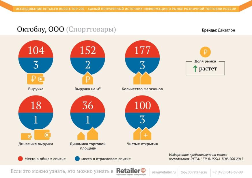 Компания Decathlon принадлежит французской семье Мюлье. Им же принадлежат компании Auchan, Atak и Leroy Merlin. Российский "Декатлон" занимает третье место по выручке и количеству магазинов в RETAILER RUSSIA TOP-200. Количество магазинов в России — 24, в Европе — 725. В прошлом году 60,5% торгового оборота приходилось на международный рынок. 39,5% — на рынок Франции. В 2014 г. компания Decathlon и все ее подразделения получили общий торговый оборот в €8,2 млрд (до вычета налогов), в 2013 г. — €7,4 млрд.