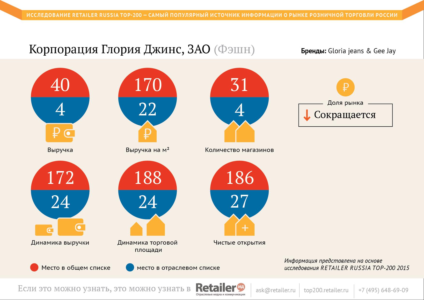 О смене формата еще весной 2015 г. заявлял основатель и владелец "Глории Джинс" Владимир Мельников. Она предполагает закрытие торговых точек площадью меньше 500 кв. м и открытие вместо них магазинов площадью свыше 1 тыс. кв. м.