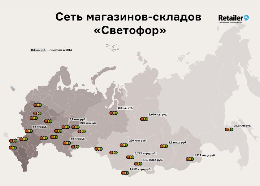 Торговая сеть "Светофор", жесткий дискаунтер, была основана в 2009 г. в Красноярске. Сейчас, по данным компании, в сети более 300 магазинов-складов. Они работают в трех десятках регионов России в основном в небольших городах. В объявлениях об аренде мест указано, что сеть интересуют населенные пункты с населением от 15 тыс. человек.