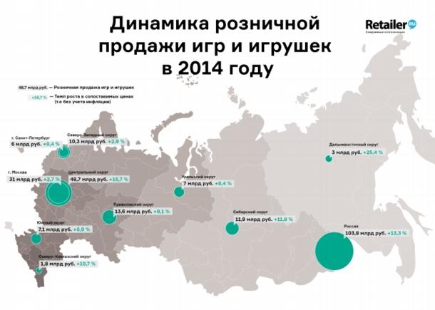 Возможно, в акценте на Москву и Петербург кроется опасность для планов компании. Дело в том, что в 2014 г. в Москве и Петербурге продажи игрушек, по данным Росстата, выросли только на 2,7% и 0,4% соответственно. Для сравнения, на Дальнем Востоке этот показатель составил 25,4%, в Сибири — 11,8%. Тем не менее, стоит признать, что Москва и Петербург обеспечили в 2014 г. 36% всех продаж игрушек по России (в Москве — 31 млрд руб., в Петербурге — 6 млрд руб.).