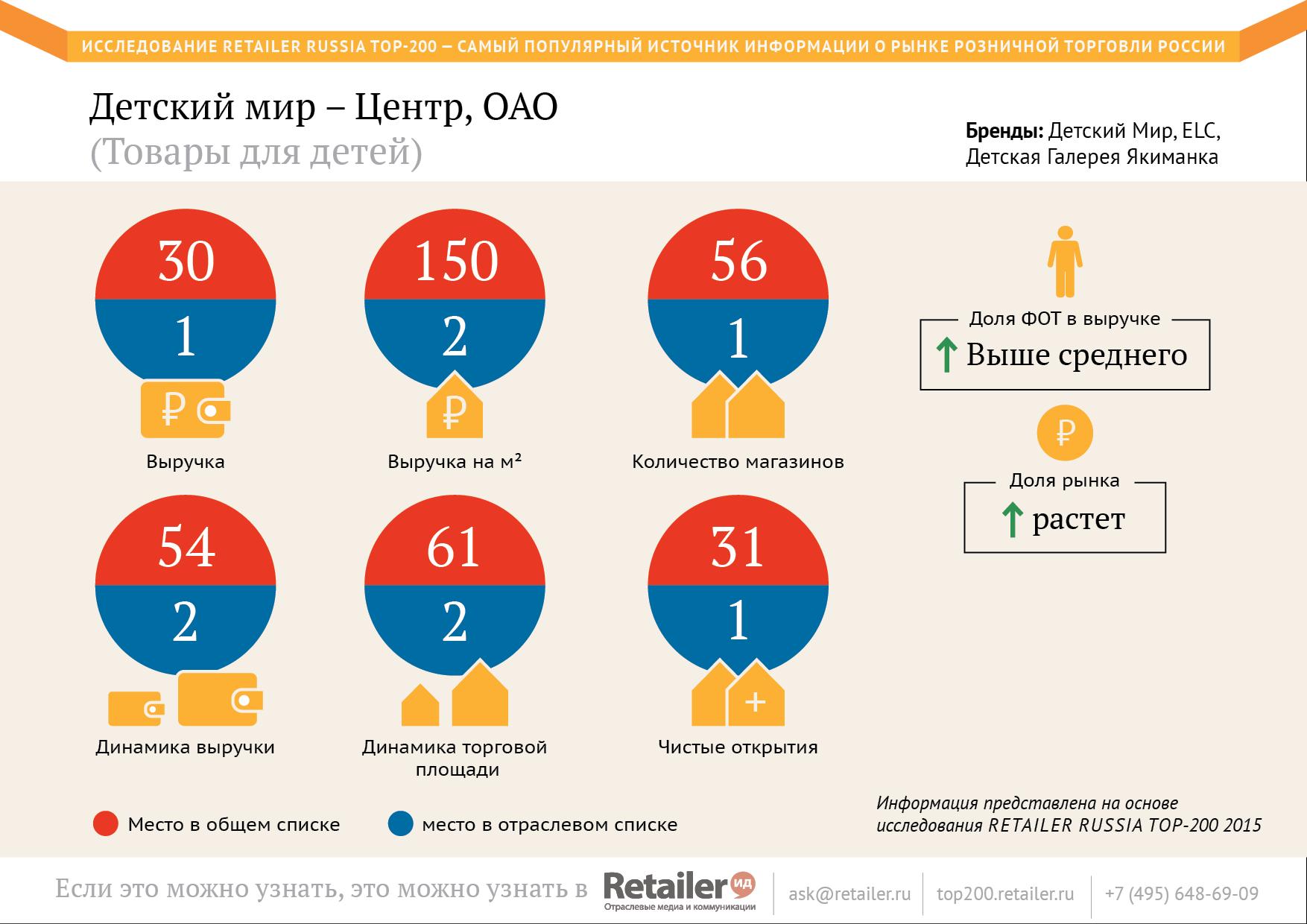 Сеть магазинов "Детский мир", несмотря на кризис и падение покупательной способности россиян, активно развивается. Генеральный директор компании Владимир Чирахов заявил на форуме Retail Business Russia, что в 2015 г. ретейлер утроил инвестиции в собственное развитие — с 1,5 млрд до 5 млрд рублей и намерен увеличить выручку примерно на 40%.