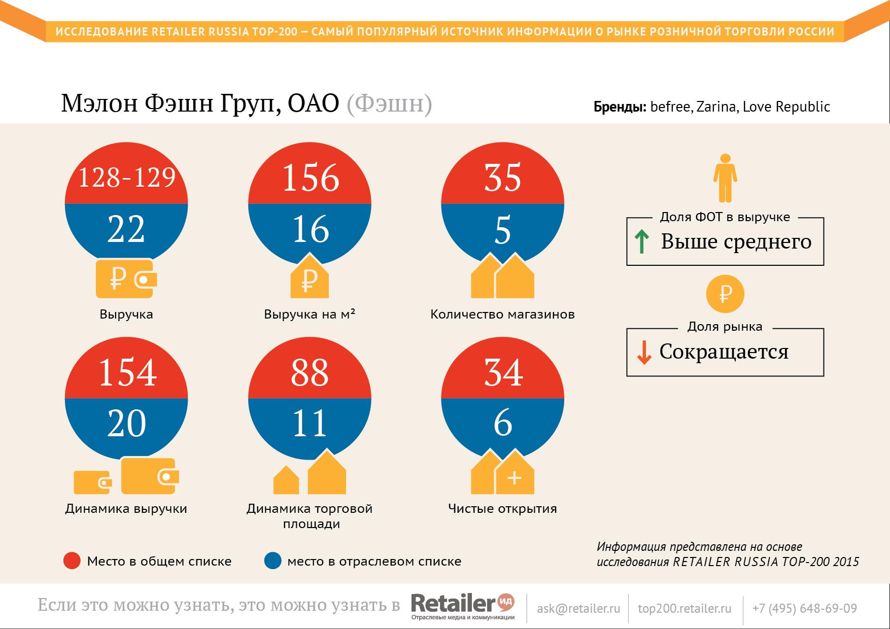 ОАО "Мэлон Фэшн Груп" управляет брендами модной одежды befree, ZARINA и LOVE REPUBLIC. Компания выполняет полный цикл деятельности модного бизнеса, начиная с моделирования, производства, закупки и заканчивая распределением, продажей, продвижением женской и мужской одежды и аксессуаров.