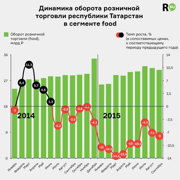 Кризис действительно сильно ударил по России и Татарстану в частности. В России оборот розничной торговли пищевыми продуктами, включая напитки и табачные изделия, падает весь год. Максимальное падение было зафиксировано в августе — этот показатель по сравнению с августом прошлого года, по данным Росстата, сократился на 10% до 1,13 трлн руб. В сентябре оборот торговли упал на 9,7% и составил 1,11 трлн руб.