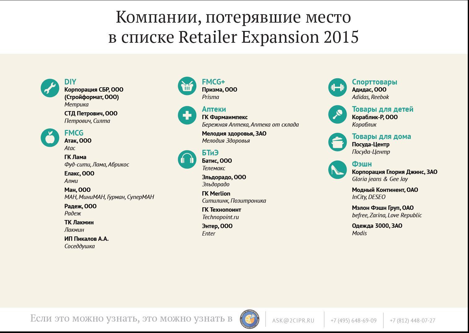 Даниил Сомов в своей презентации о положении дел в российском ретейле на выставке MAPIC в Каннах раскрыл ключевые данные о динамике роста крупнейших компаний отрасли — названия сетей, вошедших в рейтинг Retailer Expansion 2015. Это те компании, что росли быстрее среднерыночного уровня и, соответственно, наращивалю свои доли на рынке. Аутсайдеры, возможно, и не сокращали развитие, но росли медленнее рынка и отдавали свою долю конкурентам. Даниил Сомов раскрыл списки компаний, которые впервые попали в рейтинг, и тех, кто из списка вылетел.