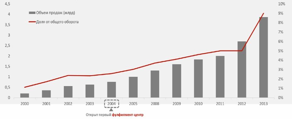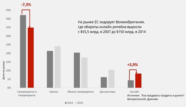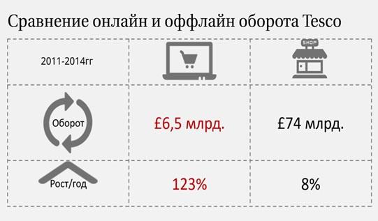 Первым интернет-магазином стал Tesco, открытый в 1999 году. Важно, что за первые 12 лет (1999-2011 гг.) доля онлайн-продаж выросла всего лишь до 5% от общего оборота (2 млрд. фунтов стерлингов, обработка 70 000 заказов в день), в то время как всего за последующие 3 года (2011-2014 гг.) доля интернет-торговли выросла еще на 4% и составила 9% от оборота (6,5 млрд. фунтов стерлингов, обработка 100 000 заказов в день). Из этого можно сделать вывод, что на создание инфраструктуры и «приучение» покупателей были потрачены огромные усилия, хотя в итоге результат оправдал ожидания.