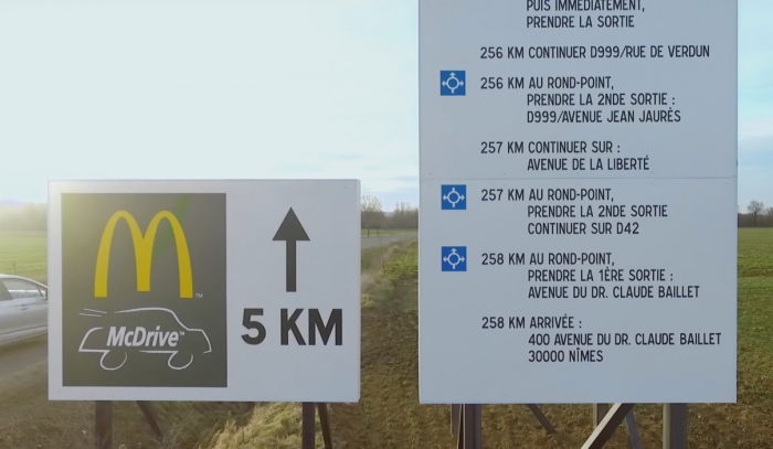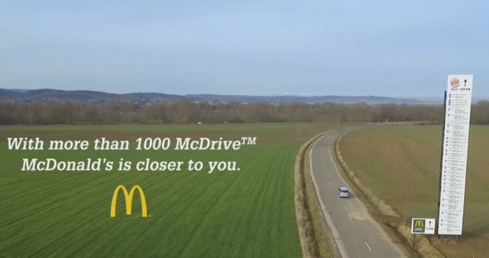 Этой зимой "Макдоналдс", решив в очередной раз потроллить конкурентов, разместил во Франции необычные билборды. На одном из них отмечен ближайший ресторан сети, до которого остаётся 5 километров пути, а на втором, чересчур длинном — точка Burger King, до которой предстоит проехать ещё 258 километров.