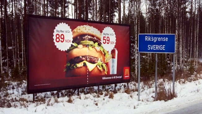 В 2014 году McDonald’s разместил на границе Норвегии и Швеции неоднозначную рекламу Биг-Мака, над которой работала команда DDB Стокгольм. Билборд, поделенный на две половины, гласил: на шведской территории цена бургер стоит дешевле, чем у соседей. Это должно было побудить прибывших норвежцев купить сэндвич в Швеции и сэкономить на этом около 5 долларов.