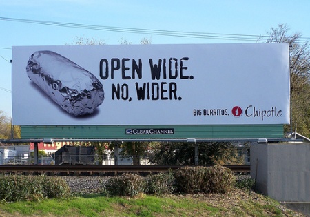 Сеть закусочных, в США, специализирующаяся на приготовлении буррито и тако, регулярно удивляет жителей США и Европы необычной наружной рекламой. В 2013 году бренд разместил билборды, на которых была изображена продукция Chipotle Mexican Grill, завернутая в фольгу. Таким образом маркетологи дали потребителям пространство для воображения и забавно обыграли то, что пришло им на ум во время разработки кампании. И, конечно же, подчеркнули натуральность продуктов.