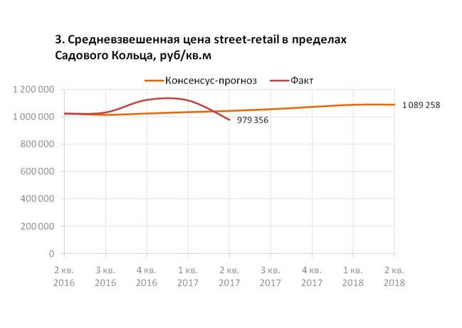 Ожидания экспертов по динамике цен купли-продажи торговой недвижимости оказались выше реальности на 19,0% (286 166 руб. за кв. м – прогноз, 240 502 руб. за кв. м – по факту). Разница между фактической (1 042 581 руб./кв. м) и прогнозной (979 356 руб./кв. м) ценой 1 кв. м стрит-ретейла в пределах Садового кольца составила 6,5%.