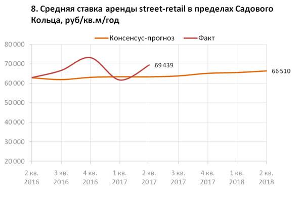 Что касается рынка аренды торговой недвижимости, то прогнозная ставка на 3,7% меньше фактической (30 239 и 31 402 руб./кв. м/год). Расхождение в сегменте стрит-ретейла центра Москвы между фактическими (63 365 руб./кв. м/год) и прогнозными данными (69 439 руб./кв. м/год) составило 8,7%.
