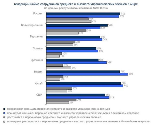 Работодатели в России сохраняют оптимизм и 70% опрошенных компаний планируют брать в штат новых специалистов и менеджеров в ближайшие три месяца, при том, что в целом в мире этот показатель равен 55%. Количество компаний, расстающихся с персоналом за год уменьшилось с 58% до 40%.