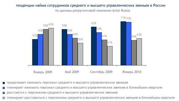 Количество компаний, подбирающих персонал в России, продолжает устойчиво расти. В январе 2009 г. лишь 42% работодателей решались на открытие новых вакансий среднего и высшего управленческих звеньев, а за год их количество выросло на 29%.