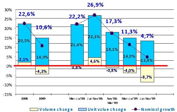 Номинальный рост рынка (по стоимости) составил 10,6%. Таким образом, темпы роста российского FMCG рынка в 2009 г. снизились более чем в два раза по сравнению с 2008 годом.