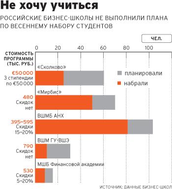 Программа МВА Высшей школы международного бизнеса (ВШМБ) АНХ состоит из пяти учебных модулей. В качестве антикризисной меры два из них отделили от прочих и теперь предлагают под названием курса профпереподготовки. «Из нашей программы МВА мы сейчас пытаемся сделать чисто антикризисную, — говорит ректор ВШМБ Леонид Евенко. — Я совместно с практикующим топ-менеджером рассказываю студентам очень важное: влияние административного ресурса на работу компании, серые схемы оплаты, искусственное банкротство». ВШМБ пошла на скидки в размере 15-25%, открыла call-центр для желающих поступить. В результате на нынешнем весеннем наборе МВА школа заработала лишь на 10% меньше, чем год назад. Сейчас ВШМБ уже начала активную маркетинговую кампанию осеннего набора.