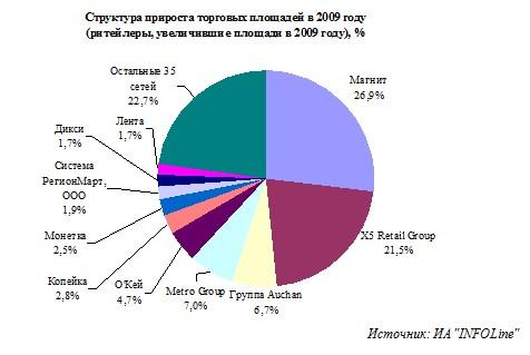 Наибольший рост за 2009 г. показали "Магнит" и X5 Retail Group, на которые приходится более 48% открытых торговых объектов.