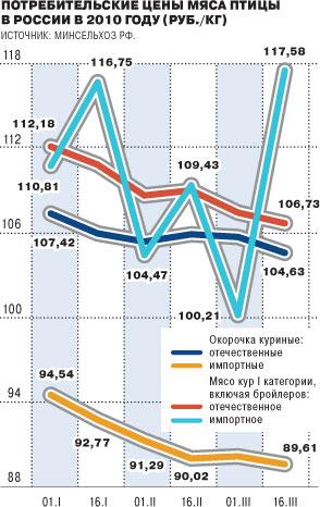 Российские производители предложение поддерживают — так, вчера Росптицесоюз заявил, что считает необходимым снизить квоты на импорт мяса птицы в РФ на 2010 год с 780 тыс. тонн до 608-610 тыс. тонн, на 2011 год — с 600 до 415 тыс. тонн, на 2012 год — с 550 до 220 тыс. тонн, заявила гендиректор объединения Галина Бобылева. "Это позволило бы развиваться отечественному птицеводству, а также обеспечить потребность населения в этом виде продукции",— отметила она, напомнив, что Минсельхоз и Минэкономики в настоящее время обсуждают возможность сокращения квот на импорт мяса птицы. По словам госпожи Бобылевой, в первом квартале 2010 года объем производства мяса птицы в РФ вырос на 16,6%, яиц было произведено на 4,4% больше — до 9,4 млрд штук. При этом импорт мяса птицы составил только 49 тыс. тонн против 147 тыс. тонн годом ранее — что и вызывает нестабильность цены этого вида продукции (см. график).