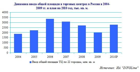 На начало 2010 г. в 22 городах исследования общий объем площадей в торговых центрах составлял около 18,5 млн. кв.м. Согласно прогнозам INFOLine, в 2010 г. в 22 городах России будет открыто около 60 торговых центров, а их общая площадь увеличится в примерно на 3 млн.кв.м. В Москве ожидается запуск 8 торговых центров, в Санкт-Петербурге – 7, в Воронеже – 5, в Омске, Новосибирске и Волгограде по 3, в Перми, Челябинске, Самаре, Екатеринбурге по 2.