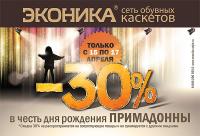 9. С 15 по 17 апреля сеть обувных каскетов «Эконика» праздновала день рождения Примадонны — Аллы Пугачевой и дарила скидки своим покупателям. На три дня предоставлялись скидки до 30% на весь ассортимент сети.
