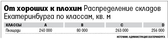 С начала 2009 г. объем складских площадей в Екатеринбурге замер на одном уровне. Как и полтора года назад, в городской администрации его оценивают в 839 000 кв. м. Из них на долю качественных площадей приходится 38%, или 320 000 кв. м: в классе А — 240 000 кв. м, в классе В — 80 000 кв. м. Некачественных площадей, по данным мэрии, — 519 000 кв. м.