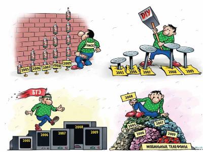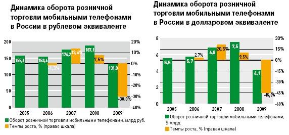 Рынок мобильных телефонов ожидаемо оказался среди лидеров падения. В 2009 г. его объем в долларовом выражении сократился на 45% по сравнению с 2008 г. и составил $4,1 млрд. Падение в рублях было чуть менее заметным (-30%).