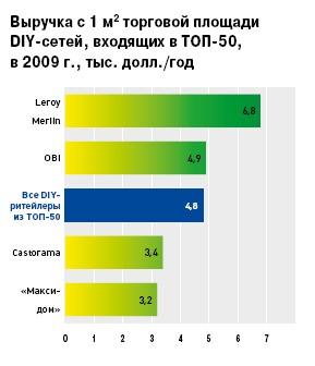 Самые лучшие показатели по выручке с 1 кв. м по сети в целом в 2009 г. продемонстрировал Leroy Merlin ($6,8 тыс./год). Также неплохие результаты, по данным INFOLine, показали московские магазины сети OBI (около $10 тыс./год). Если бы не кризис в строительстве, повлекший за собой резкое падение продаж в корпоративном сегменте, DIY-сети выглядели бы намного лучше. Впрочем, были в 2009 г. приятные моменты и для этого сегмента рынка. В частности, зимой и весной, в связи с девальвацией рубля, большинство сетей смогли увеличить свою маржинальность за счет повышения цен на импортную продукцию.
