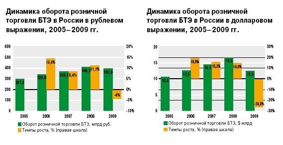 По данным INFOLine, в 2009 г. объем рынка БТЭ составил $12,4 млрд, что почти на 25% меньше по сравнению с предыдущим годом. Впрочем, из-за девальвации и роста рублевых цен снижение в рублях оказалось незначительным (всего 4%).