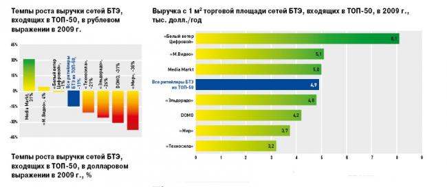 Доля крупнейших сетей рынка БТЭ, вошедших в топ-50 ритейлеров по версии Retailer Magazine, в обороте розничной торговли бытовой техникой в 2009 г. составила 57%, снизившись по сравнению с 2008 г. на 7,3%. Если вспомнить, какие неприятности в прошлом году переживали два крупнейших игрока рынка «Техносила» и «Мир», этому вряд ли стоит удивляться. «Техносила» и «Мир» в 2009 г. ожидаемо продемонстрировали отрицательную динамику выручки; зато сюрпризом стало то, что к ним присоединилась и сеть «Эльдорадо», которую не спасла даже оптимизация торговых площадей. Однако «Медиа-Маркт-Сатурн» и «М.Видео» порадовали рынок, увеличив рублевую выручку на 31,5% и 3,64% соответственно. А вот самую хорошую выручку с 1 кв. м в прошлом году показал «Белый ветер Цифровой».