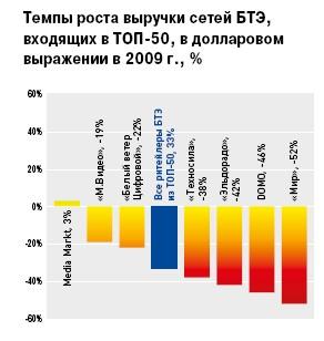2009 г. стал критическим сразу для трех крупнейших российских сетей: «Мир», «Техносила» и «Эльдорадо». В связи с финансовыми трудностями компания «Мир» практически покинула рынок (к началу 2010 г. оказались закрыты все 18 магазинов московского дивизиона, а 30 магазинов, работающих в регионах, начали распродавать складские остатки). «Техносила» столкнулась с чрезмерной долговой нагрузкой и начала процедуру банкротства (в августе 2009 г., после того как владельцы «ГК «СВ» Виктор и Вячеслав Зайцевы заложили 49% сети по кредиту на $161 млн, МДМ банк стал залогодержателем ее основных активов и объявил, что намерен перепродать компанию). «Эльдорадо» тоже был вынужден закрыть ряд магазинов, а в итоге и вовсе продать оставшуюся часть бизнеса чешской PPF Group.