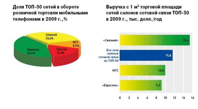 Из плюсов 2009 г. для рынка мобильных телефонов было, пожалуй, только то, что доля крупнейших сетей из топ-50 ритейлеров в обороте торговли мобильными телефонами составила 85,7%, увеличившись по сравнению с 2008 г. на 10%. Однако даже лидеры рынка демонстрировали отрицательную динамику выручки. Так, темпы роста оборота ГК «Связной» в долларовом выражении снизились на 45,7%, а «Евросети» – на 45%. Ключевыми событиями 2009 г. на рынке мобильных телефонов стали банкротства крупных ритейлеров: с начала кризиса ушли с рынка «Диксис», «Беталинк» и «Цифроград». «Диксис» прекратила свою работу после неудачной попытки Альфа-банка спасти сеть. «Беталинк» сам подал иск о банкротстве, не сумев договориться о партнерстве с МТС. «Цифроград», который до кризиса был третьим сотовым ритейлером России по продажам телефонов, не смог договориться с «Мегафоном» и в августе 2009 г. подал иск о банкротстве. Зато в 2009 г. ряды сотовых ритейлеров пополнились новым игроком – сетью МТС, которая вышла на рынок путем покупки сетей «Телефон.ру», «Телефорум» и «Эльдорадо», отчего сразу же оказалась в тройке лидеров по доле рынка и дебютантом рейтинга Retailer Magazine.