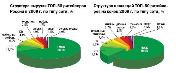 В 2009 г. оборот российского ритейла достиг 14,6 трлн руб. При этом выручка топ-50 российских ритейлеров составила 1878,8 млрд руб. (12,8% от совокупного оборота; этот показатель мало чем отличается от данных 2008 г., когда на долю 50 крупнейших ритейлеров России приходилось 12,6% от оборота розницы). В совокупном объеме выручки топ-50 ритейлеров наибольшая доля ожидаемо принадлежит сетям FMCG (69,1%); далее следуют сети бытовой техники и электроники – 12,1%, и сети мобильных телефонов – 6,0%. В структуре торговых площадей аналогичная картина: лидирующее положение здесь занимают продуктовые сети (61,9% торговых площадей занимают продуктовые сети, входящие в рейтинг топ-50 по версии Retailer Magazine). На втором месте обосновались сети бытовой техники и электроники (17,2%), на третьем – магазины формата DIY и товаров для дома (6,6%).