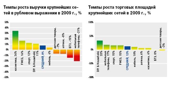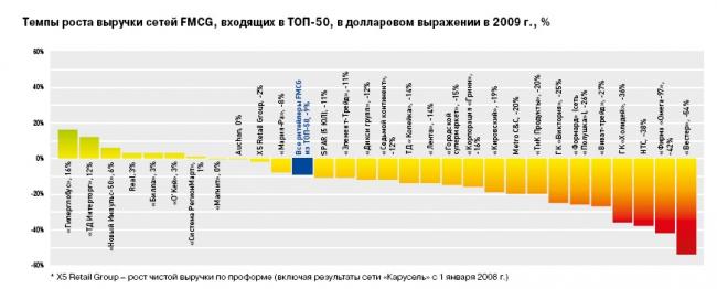 2009 г. оказался сложным для российских ритейлеров: большинство сетей сократили выручку даже в рублевом выражении и только некоторые показали рост. Наибольший рост выручки среди крупных ритейлеров в 2009 г. показали «Гиперглобус», «ТД Интерторг» (сети «СемьЯ», «Идея»), «Новый Импульс-50» (сеть «Утконос») и, конечно же, X5 Retail Group N.V. и «Магнит», которые увеличили выручку в рублях на 25% и 28% соответственно.