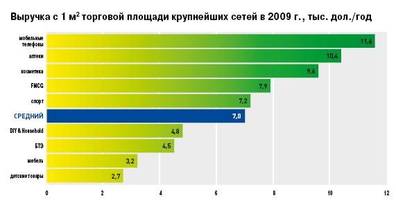 Максимальные темпы роста торговых площадей в 2009 г. были характерны для DIY-сетей (33%). Максимальные показатели выручки с 1 кв. м торговой площади в 2009 г. продемонстрировали сети мобильных телефонов ($11,6 тыс.) и аптеки ($10,4 тыс.). Минимальная выручка с 1 кв. м торговой площади, $2,7 тыс., характерна для сетей детских товаров.