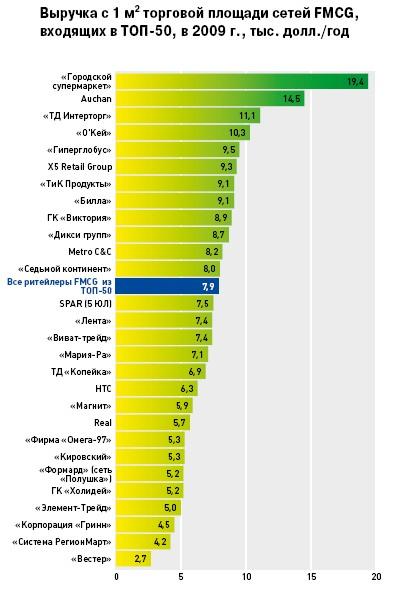 Однако были в прошлом году и приятные сюрпризы. Например, компания «Городской супермаркет» (развивает сеть «Азбука вкуса») показала впечатляющую выручку с квадратного метра ($19,4 тыс./год), обойдя по этому показателю даже Auchan ($14,5 тыс./год).