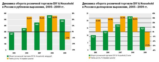 По данным INFOLine, емкость рынка DIY & Household в 2009 г. снизилась на 12% в рублевом выражении и на 31,5% в долларовом и составила 500 млрд руб ($15,7 млрд).