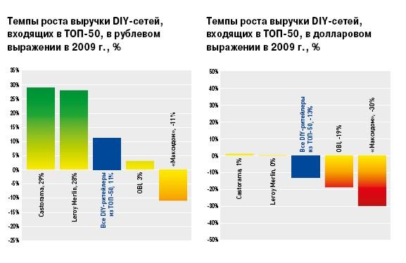 По данным агентства INFOLine, доля крупнейших сетей DIY & Household, входящих в топ-50 ритейлеров, в 2009 г. составила 15,2% (рост на 3,2% по сравнению с 2008 г.). При этом «большая тройка» международных ритейлеров – OBI, Leroy Merlin и Castorama (в отличие от их российских коллег) – смогла нарастить выручку в рублевом выражении даже в условиях экономического кризиса. Крупнейший из российских ритейлеров, «Максидом», в 2009 г. снизил выручку в рублевом выражении на 10,8% и вынужден был закрыть гипермаркет в Краснодаре. А в 2010 г. акционеры, не удовлетворенные динамикой развития сети, и вовсе сменили генерального директора.