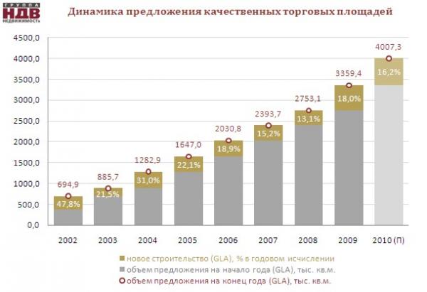 В первом полугодии 2010 года суммарный ввод торговых площадей превысил 480 000 кв.м. (арендопригодная торговая площадь составила 173 500  кв.м.), что почти в 1,5 раза меньше аналогичного показателя 2009 г.  По статистике аналитического департамента компании «НДВ-Недвижимость», по итогам первого полугодия совокупный объем предложения площадей качественных торговых центров на рынке Москвы составил порядка 7 млн. кв.м. общей площади, при этом арендопригодная торговая площадь составила 3,5 млн. кв.м.