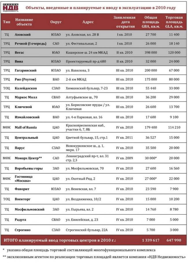 По данным аналитической службы компании «НДВ-Недвижимость», огромный объем ввода торговых площадей, запланированный на 2010 г., обеспечен крупными центрами, строительство которых было заморожено в период кризиса и открытие было перенесено.