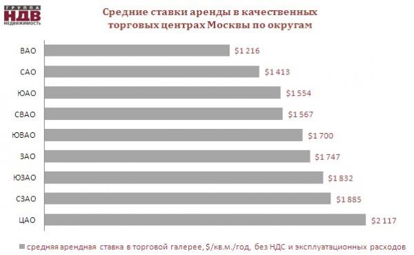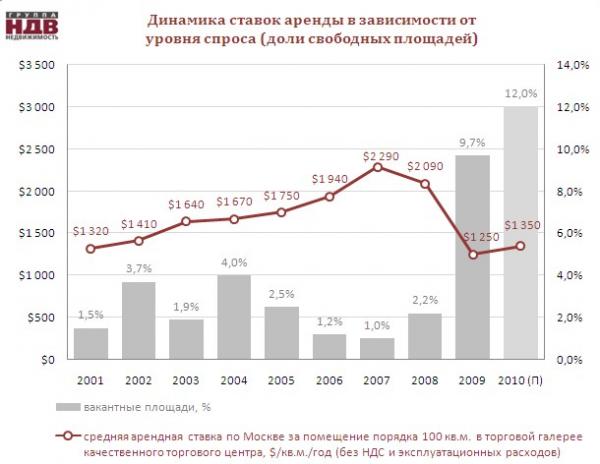 «Предпосылок к существенному увеличению или снижению ставок аренды нет: активный рост будет сдерживаться продолжающимся инерционным вводом крупных объектов, а снижению будет препятствовать активная экспансия и спрос со стороны развивающихся международных и федеральных ритейлеров.  Незначительное (в среднем на 8%) повышение коммерческих цен ожидается в качественных концептуальных торговых объектах по итогам 2010 г. На интенсивный рост арендных ставок можно рассчитывать лишь в 2012―2013 гг., когда на рынке возникнет дефицит нового предложения качественной торговой недвижимости ― последствие того, что в 2009 г. девелоперы практически не заявляли новые проекты», — говорится в исследовании «НДВ-Недвижимость».