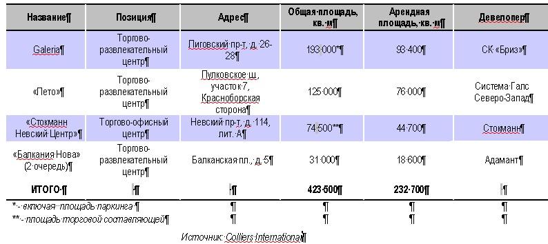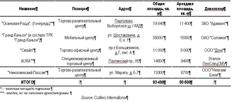 По данным компании Colliers International, на конец июня 2010 г. в Санкт-Петербурге функционировало 153 торговых объекта, совокупная общая площадь которых составила 3,88 млн кв. м, арендная – 2,5 млн кв. м. При этом, за первое полугодие 2010 г. было введено в эксплуатацию пять новых торговых объектов арендной площадью 50 500 кв.м. В первом полугодии 2009 г. ни один торговый объект не был введен в эксплуатацию.