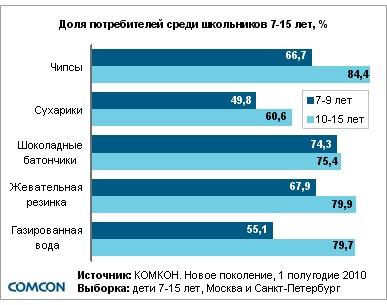Школьники активно тратят карманные деньги на чипсы и жевательную резинку, таковы результаты регулярного исследования «Новое поколение», проводимого компанией «Комкон». Исследование изучает потребление школьниками, проживающими в Москве и Санкт-Петербурге, таких продуктов как чипсы, упакованные сухарики, шоколадные батончики, жевательная резинка и газированная вода.