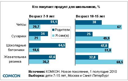 Среди школьников 10-15 лет большинство совершает самостоятельные покупки. Чипсы и жевательную резинку дети гораздо чаще покупают по своей собственной инициативе (около 70% самостоятельных покупок в этой возрастной группе). Половина опрошенных покупает упакованные сухарики (50%) и шоколадные батончики (52%), при этом шоколадные батончики родители и дети покупают в равной степени.