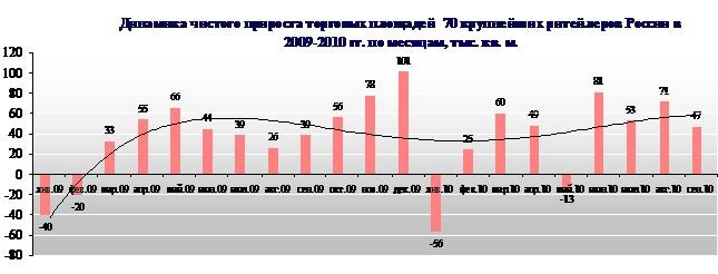 Общее число дискаунтеров и магазинов у дома составило на 1 октября 2010 г. около 9 335 торговой площадью около 3,3 млн. кв. м. Прирост за январь-сентябрь 2010 г. – более 296 000 кв.м.