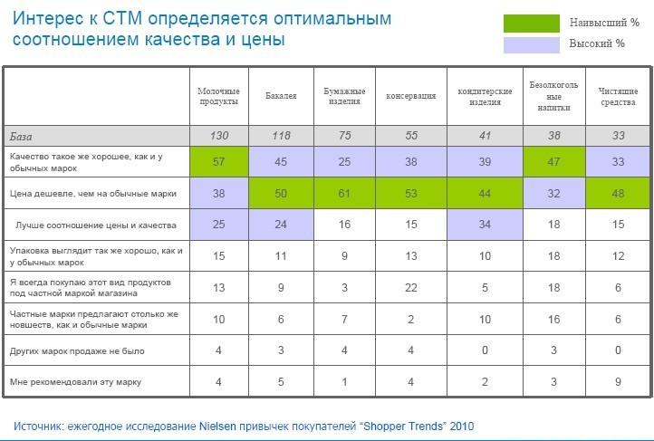 Причем, за 2009г. доля СТМ на российском рынке существенно не изменилась (по сравнению с 2008 г. уменьшилась с 2,8%  до 2,7%). «В объеме продаж отдельных сетей нет однозначного тренда, так как результат определяется успешностью конкретных действий конкретных менеджеров», — считает директор отдела по работе с розничными сетями «Nielsen Россия» Денис Шириков.