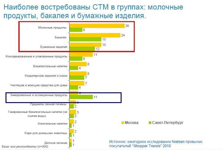 Доля СТМ в продажах кофе не превышает 5,2%, снеков — 3,5%, замороженных продуктов — 6%, бакалеи — 18%.  Согласно опросу потребителей, проведенному компанией Nielsen, в России в сегменте СТМ наиболее востребованы такие категории, как молочные изделия, бакалея, бумажные изделия, замороженные и охлажденные продукты.
